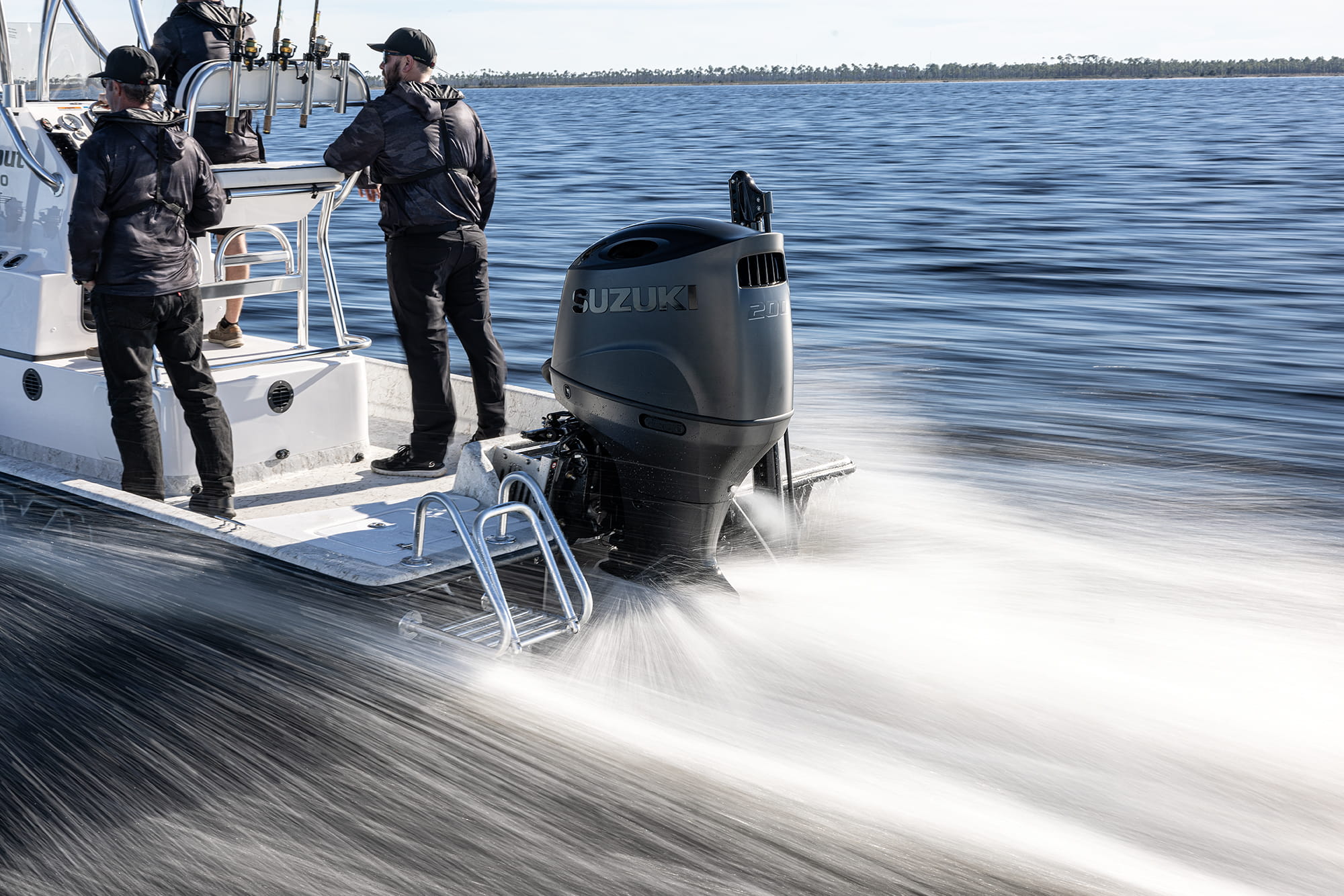 Suzuki four-stroke outboards have long been noted for their exceptionally quiet operation. Suzuki engineers go to great lengths incorporating methods designed to keep outboard operation as quiet as possible. In a noise comparison test between the DF200A and a competing 200HP in-line four-stroke outboard, the results clearly show that the DF200A runs quieter than its competitor.