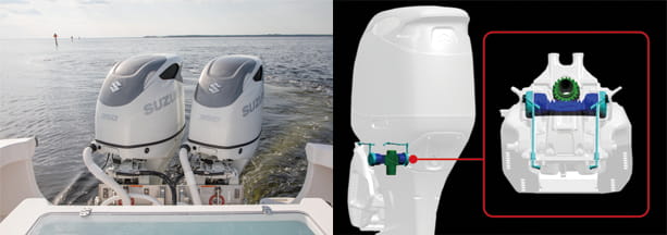 The DF350AMD/DF300BMD are equipped with a dog-leg shaped Dual Louver at the air intake to remove water from the air taken into the cowl. Incorporating a direct intake system makes the compression ratio of 12.0:1 (DF350AMD), 10.5:1(DF300BMD) possible, ultimately leading to a higher engine output.